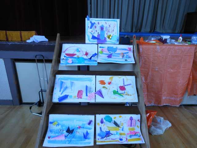 子ども達が作った作品を使って、絵を仕上げていく画家。